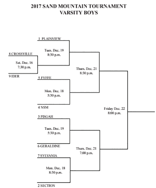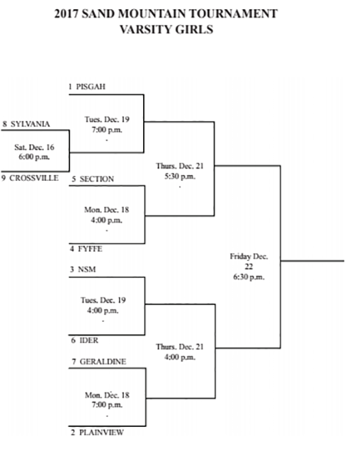 PHOTO: The Varsity Boys and Girls Brackets for the 2017 Sand Mountain Tournament. See below for the JV Schedule.