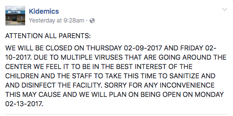 Yesterday, the business shared a post on Facebook, notifying parents that the daycare would be closed on Thursday and Friday: